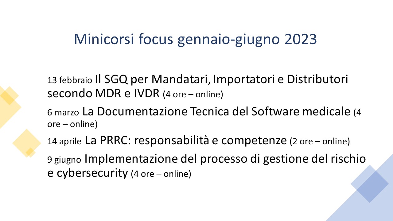- la presentazione della Documentazione Tecnica per il Software medicale (info e modalità di iscrizione disponibili al seguente link);